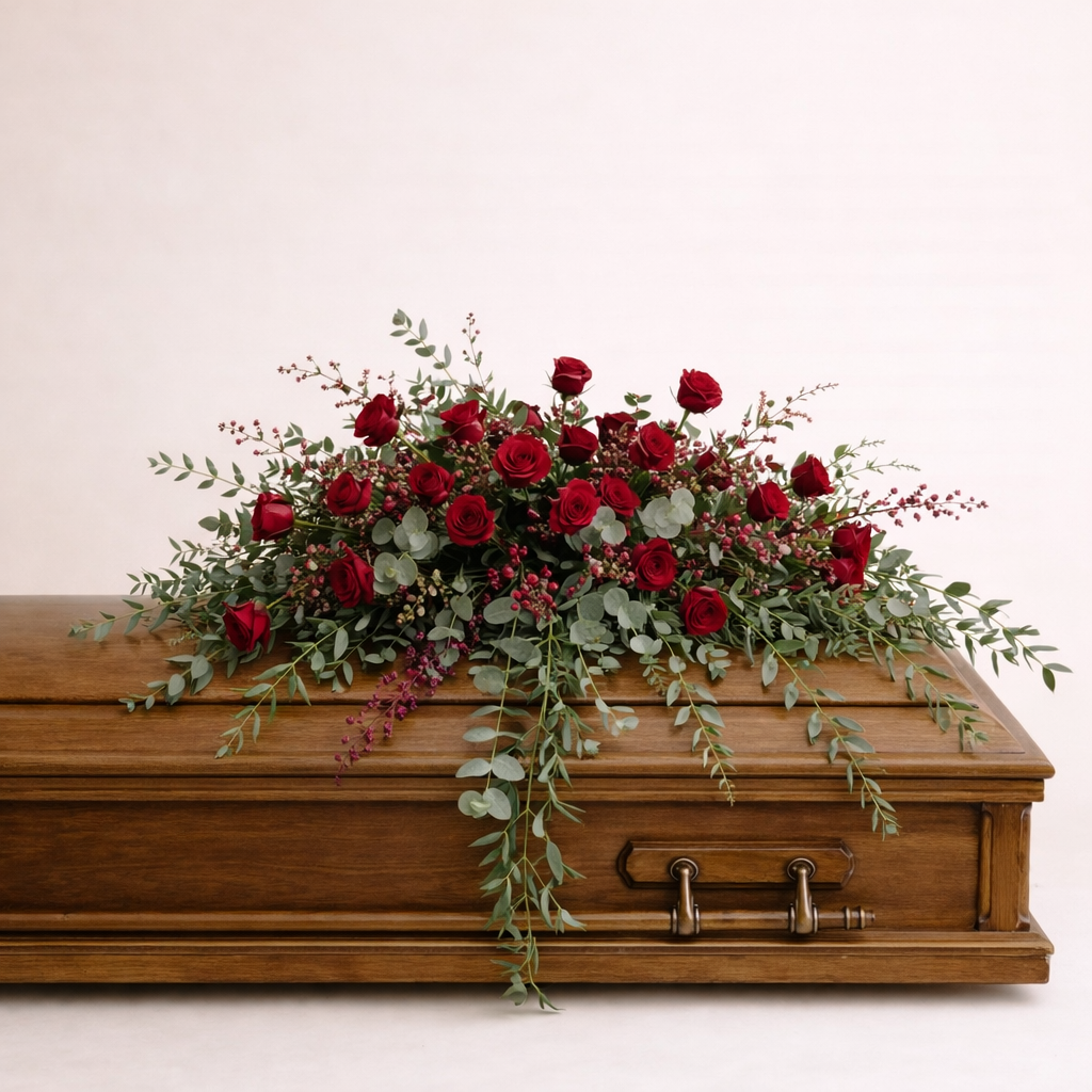 Fleurs rouge principalement composées de chrysanthème, meuflier, rose et d’eucalyptus.